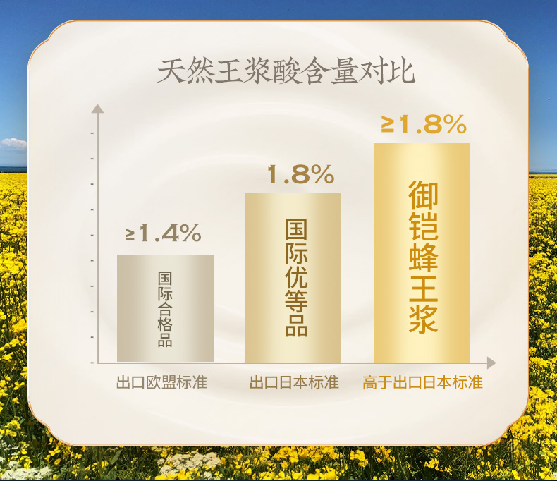 “御鎧”蜂王漿是青海新鎧實業(yè)有限公司在中國市場推出的品牌包裝產品。其選用王漿酸含量達到1.8%以上的油菜蜂王漿,這一特點使其在同類產品中脫穎而出。油菜蜂王漿因其高營養(yǎng)價值和獨特的生物活性成分,深受消費者的喜愛。